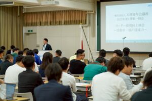 講師に:オフィスゼロトゥーワン 代表であり、原田メソッド認定パートナー濱地 秀穂 氏をお招きし、日本一の目標達成法といわれメジャーリーガーの大谷選手も実践したことで有名な原田メソッドを用い、自立型人間の定義と成功の技術や目標設定の意義と「目的・目標の4観点シート」の実践を学びました。